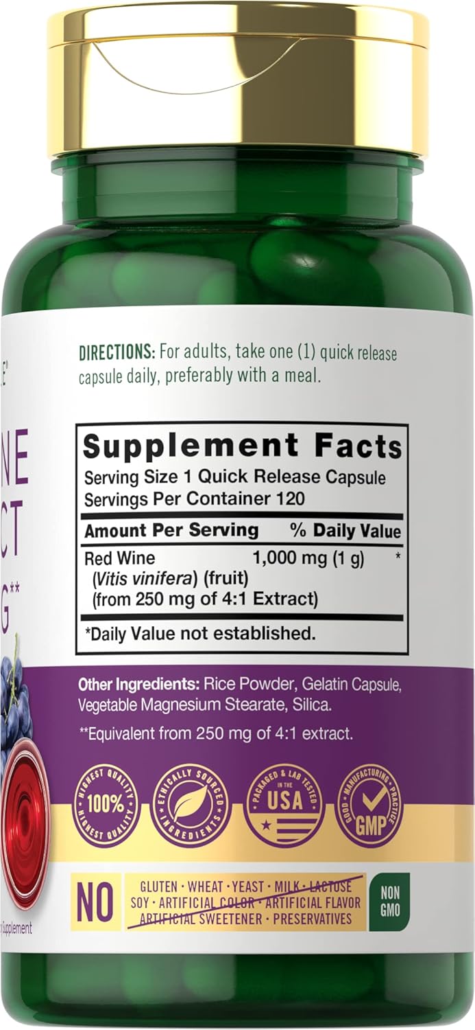 A1: Carlyle Red Wine Extract Capsules are a dietary supplement that provides the equivalent of 1,000 mg of red wine per serving in quick-release capsule form. They are designed to offer the potential health benefits of red wine, such as antioxidants, without the effects of alcohol.
