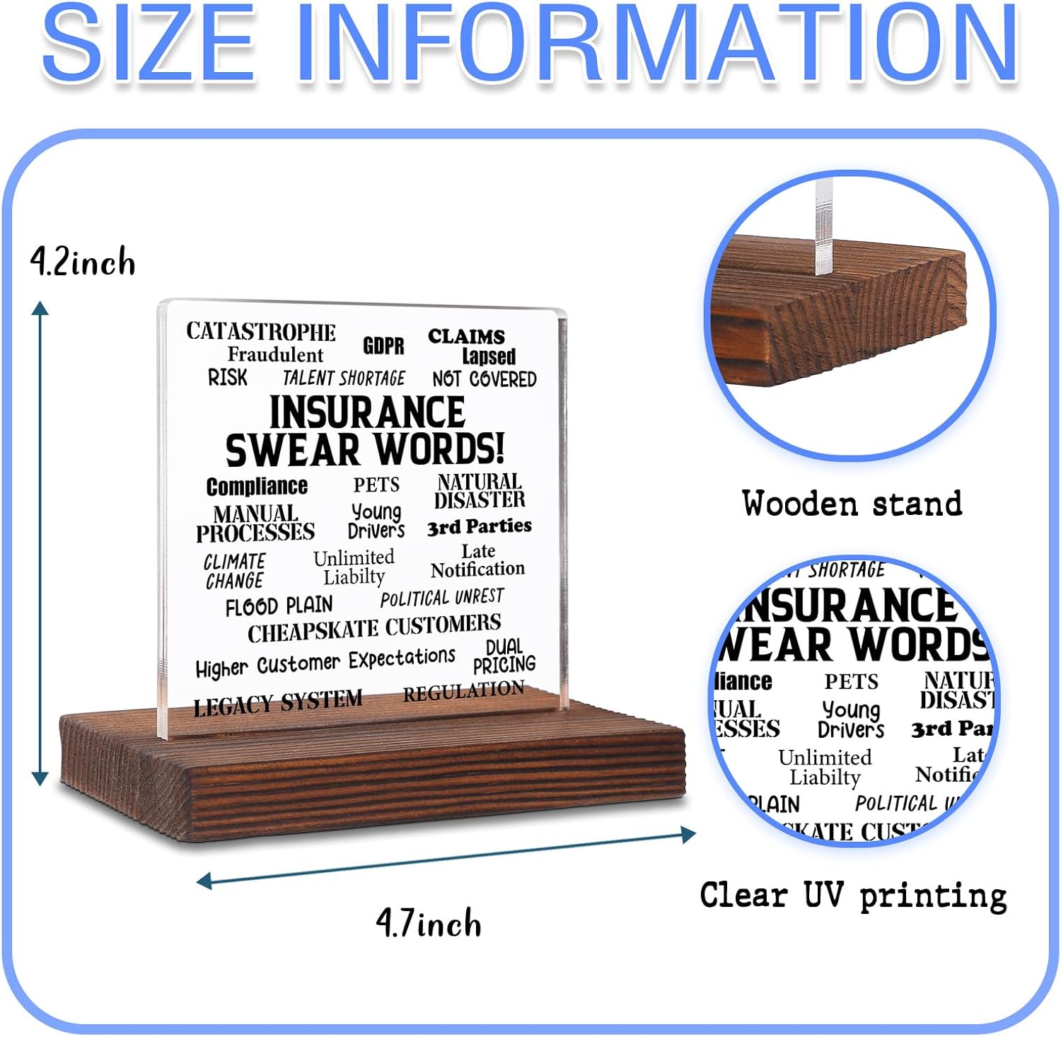 When it comes to finding the perfect gift for someone in the insurance industry, the Insurance Swear Words Desk Sign really stands out. This humorous plaque not only brings a touch of fun to the office, but it also resonates deeply with insurance agents, claims adjusters, and brokers alike. Measuring approximately 4.9 x 4.2 inches, it’s the perfect size to fit snugly on any desk or cubicle.The sturdy acrylic paired with a beautifully crafted burnt pine wood base ensures that this sign is both durable and aesthetically pleasing. We believe it’s a fantastic way to lighten the mood in a profession that can often be a bit too serious.
